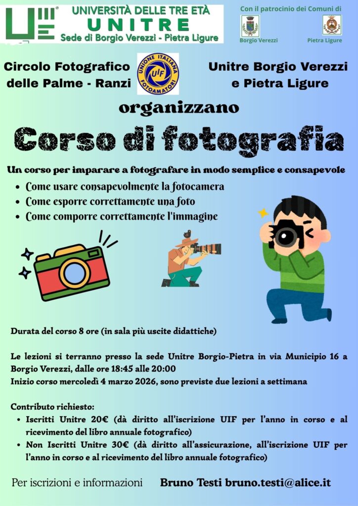 Il Circolo Fotografico delle Palme – Ranzi (affiliato UFI) e l’Unitre di Borgio Verezzi e Pietra Ligure organizzano un corso di fotografia con l’obiettivo di imparare ad utilizzare al meglio la propria fotocamera anche attraverso esercitazioni pratiche in esterna.