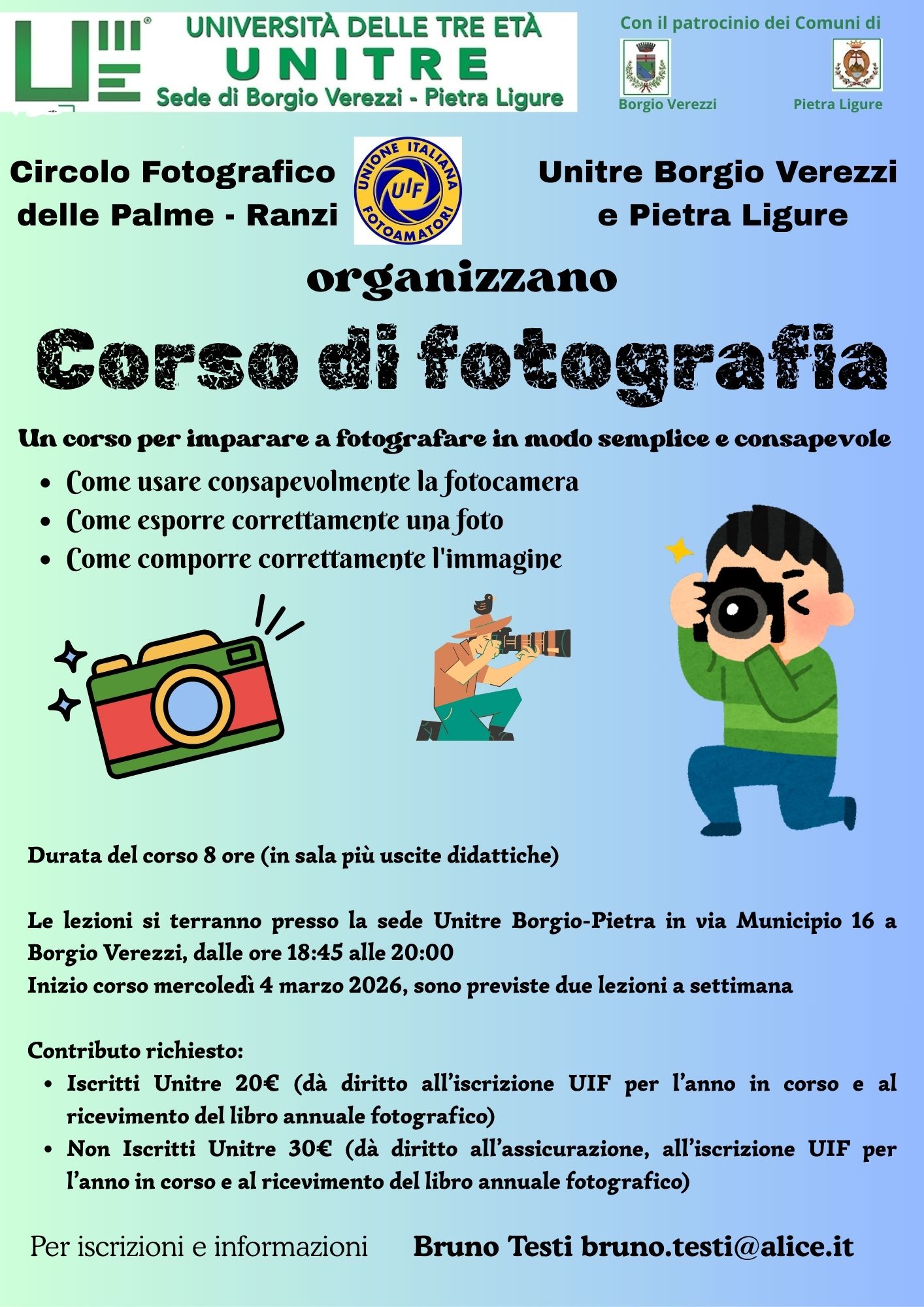 Il Circolo Fotografico delle Palme – Ranzi (affiliato UFI) e l’Unitre di Borgio Verezzi e Pietra Ligure organizzano un corso di fotografia con l’obiettivo di imparare ad utilizzare al meglio la propria fotocamera anche attraverso esercitazioni pratiche in esterna.