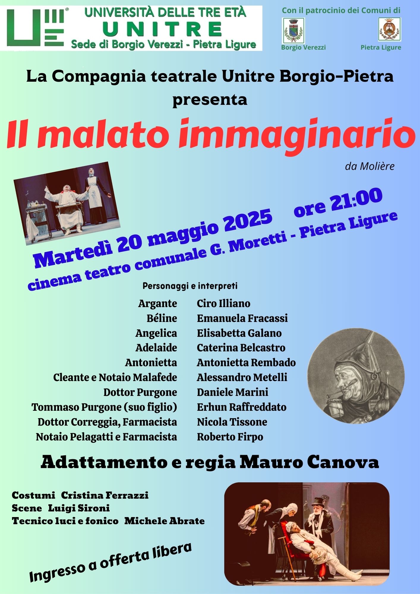 L’invito è per martedì 20 maggio, alle ore 21:00, presso il cinema teatro G. Moretti a Pietra Ligure per assistere a “Il malato immaginario” in cui Molière mette in scena le vicende familiari di un ipocondriaco, Argante, che si circonda di medici inetti e furbi farmacisti, ben contenti di alimentare le sue ansie per tornaconto personale.