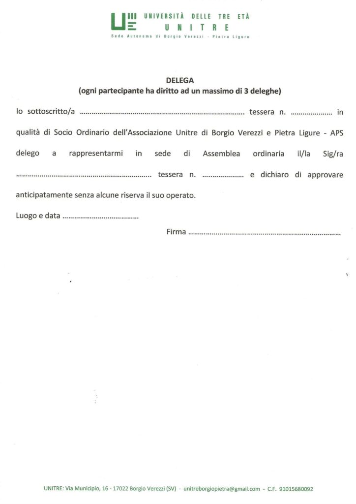 Considerata l’importanza della convocazione, nell’eventuale impossibilità a partecipare personalmente, si prega di compilare la delega in calce e di consegnarla ad altro Associato oppure inviarla per mail a segreteria.unitreborgiopietra@gmail.com