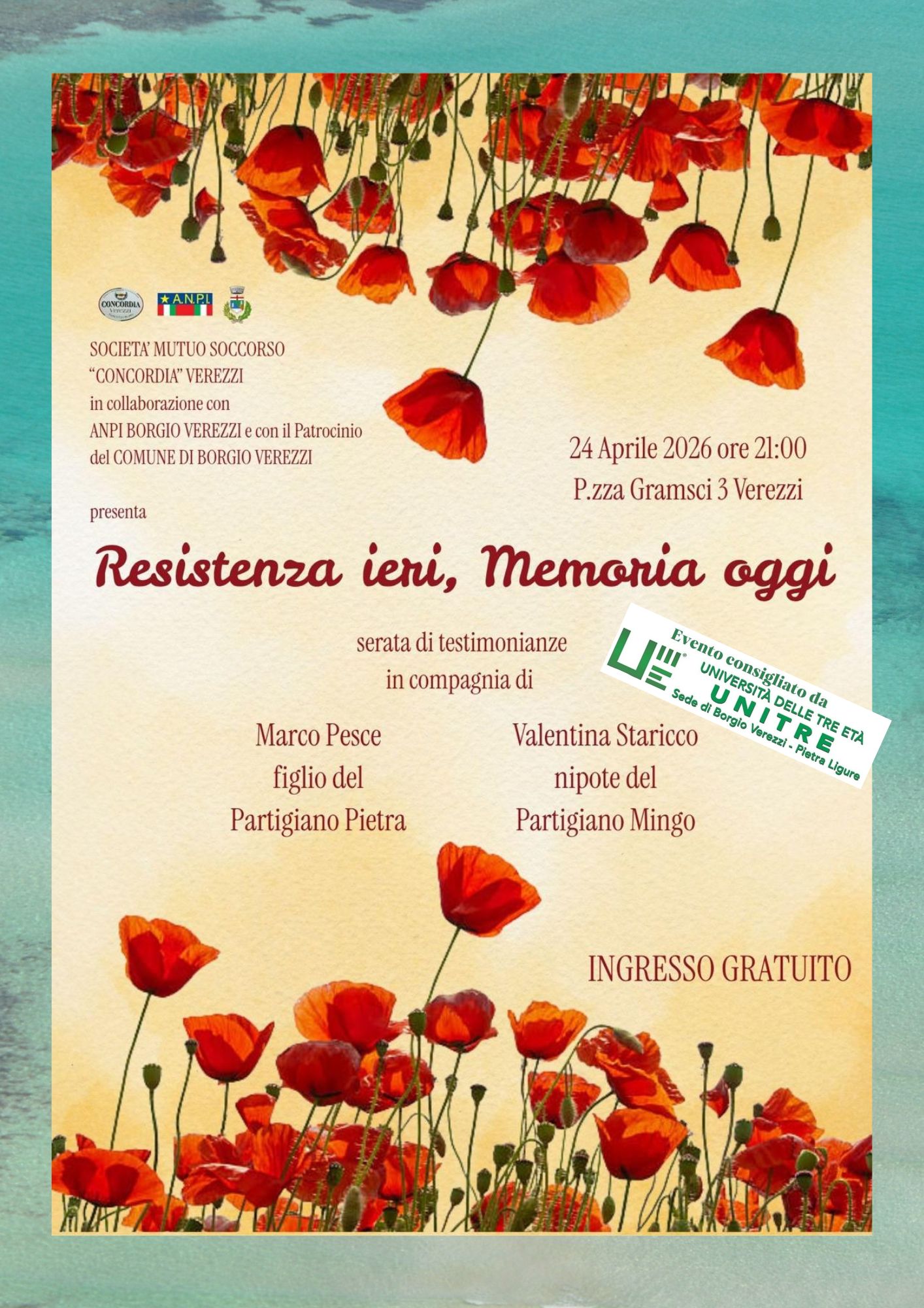 In occasione del 25 Aprile, vi invitiamo a una serata di testimonianze per ricordare e riflettere insieme sui valori della Resistenza, il 24 aprile 2026 alle ore 21:00 a Verezzi, in piazza Gramsci 3.