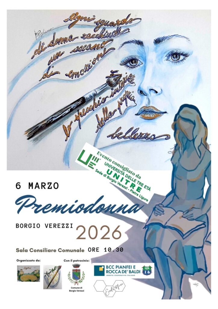 L’Associazione “AGORÀ” di Borgio Verezzi, in occasione della Giornata Internazionale dei diritti delle donne, invita venerdì 6 marzo alle ore 10:30 presso la Sala Consiliare del Comune di Borgio Verezzi, alla consegna del “PREMIO DONNA 2026”.