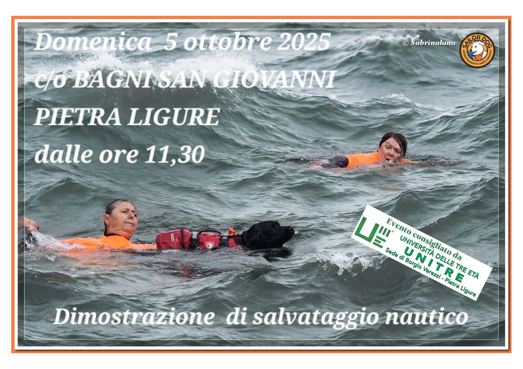 Domenica 5 ottobre 2025, alle ore 11:30, presso i Bagni San Giovanni sul lungomare Bado a Pietra Ligure, dimostrazione di salvataggio nautico a cura della Sailor Dog – Unità Cinofile Salvataggio Nautico di Cassano d’Adda.