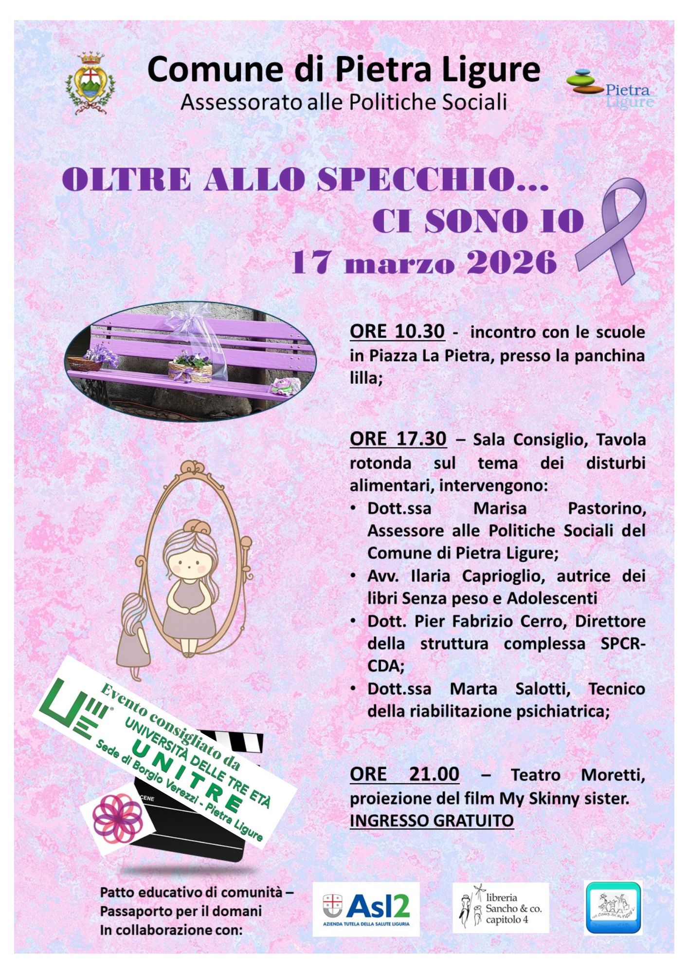 La giornata si aprirà alle ore 10:30, con un incontro dedicato alle scuole e alle associazioni del territorio presso la panchina lilla di piazza La Pietra, simbolo della lotta ai disturbi del comportamento alimentare, presidio visibile e permanente, monito quotidiano contro l’indifferenza e invito alla solidarietà, alla consapevolezza e all’ascolto. Alle ore 17:30, il dibattito si sposterà nella Sala Consiliare “Augusto Rembado” del Palazzo Comunale, con una tavola rotonda che offrirà un approfondimento tecnico e divulgativo alla quale interverranno l’Assessore alle politiche sociali e giovanili del Comune di Pietra Ligure Marisa Pastorino, l’Avv. Ilaria Caprioglio, autrice dei libri “Senza peso” e “Adolescenti”, il Dott. Pier Fabrizio Cerro, Direttore della struttura complessa SPCR-CDA Servizio Psichiatrico di Cura e Riabilitazione – Centro Disturbi Alimentari dell’ASL 2 che ha sede presso l’Ospedale Santa Corona di Pietra Ligure e la Dott.ssa Marta Salotti, Tecnico della riabilitazione psichiatrica. La giornata si concluderà, alle ore 21:00, al Cinema teatro Guido Moretti, con la proiezione, a ingresso libero e gratuito, del film My Skinny Sister, un’opera intensa che racconta l’impatto dei disturbi alimentari all’interno delle dinamiche familiari.