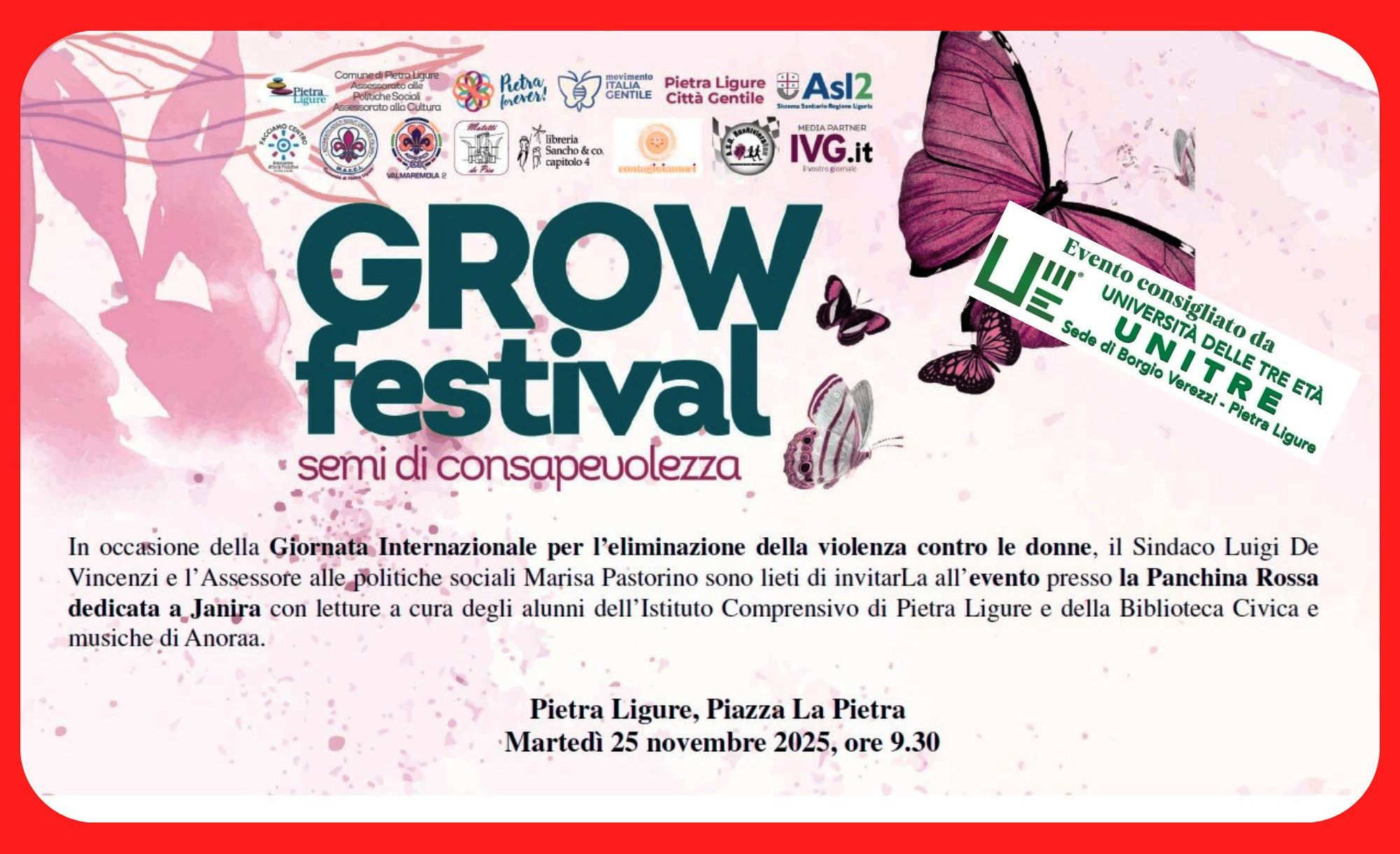 Martedì 25 novembre 2025, alle ore 9:30, in piazza La Pietra a Pietra Ligure, in occasione della Giornata internazionale per l’eliminazione della violenza contro le donne, si svolgerà un momento di riflessione presso la Panchina Rossa dedicata a Janira, con letture a cura degli alunni dell’Istituto Comprensivo di Pietra Ligure e della Biblioteca Civica e musiche di Anoraa.