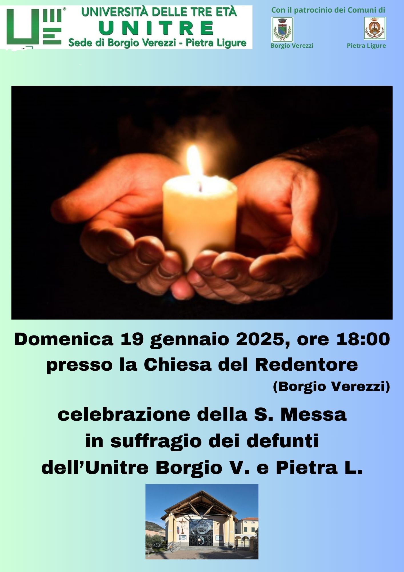 Domenica 19 gen. 2025, alle ore 18:00, presso la Chiesa del Redentore a Borgio Verezzi, sarà celebrata la S. Messa in suffragio dei defunti dell’Unitre di Borgio V. e Pietra L.